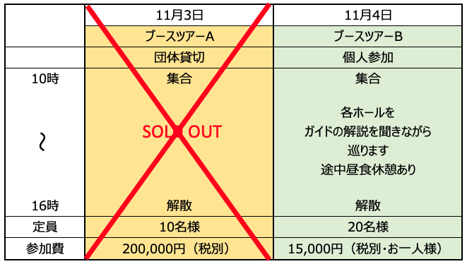 ※ 当ブースツアーは、現地集合、現地解散となります。ご参加の皆さまには、集合場所・時間等、詳細のご案内を発信致します。